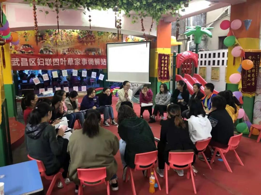 武昌区妇联还组建了由心理咨询师、律师等专业人员以及妇联干部、巾帼志愿者三支队伍组成的家事调解人才库,通过每年举办基层妇干业务培训班,对全区家事调解员队伍进行专题培训;每月定期召开“四叶草”家事调解站督导会,定期对婚姻家庭纠纷多元化解工作、家庭建设服务情况进行总结。仅2019年,采取线上、线下形式开展了区、街、社区“四叶草”三级家事调解站层级培训和团体辅导160余场,推广情感接待法、就事论理法、法律破解法等能够对婚姻家庭矛盾纠纷排查化解起到指导作用的调解技巧,进一步提高了家事纠纷人民调解工作的专业化水平,受到辖区居民的欢迎。