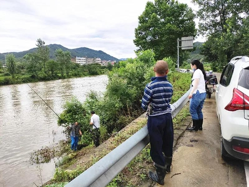 罗田县凤山镇妇联主席晏虹娜进行防汛巡查,劝返钓鱼群众。