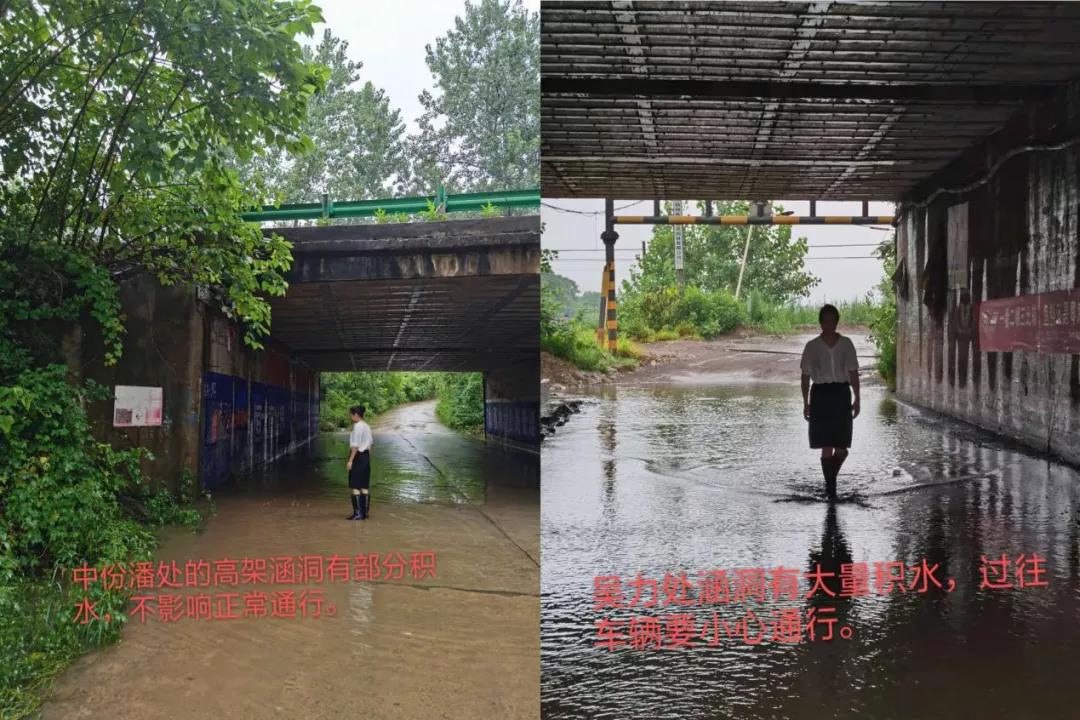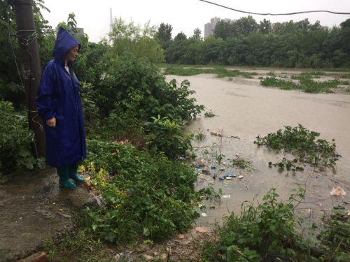 鄂州市红莲湖新区妇联主席陈翠红在中份潘和吴屴涵洞查看积水。