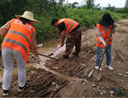 鄂州市鄂城区金鸡桥社区防汛一线女同志参与挖沟排水。