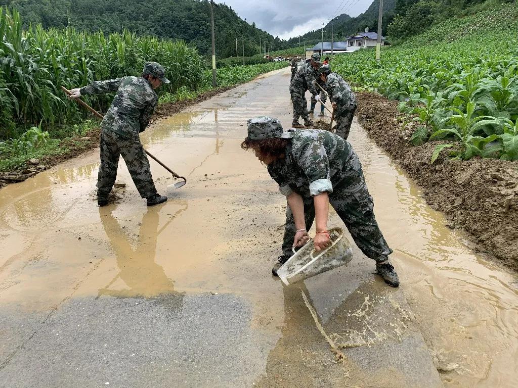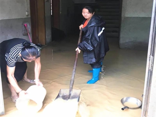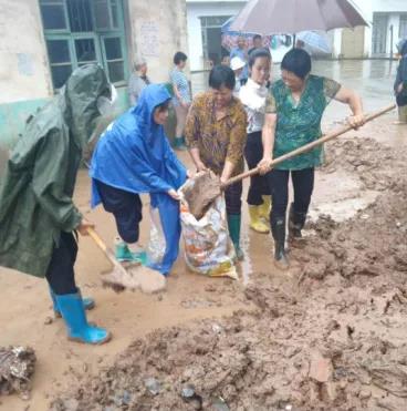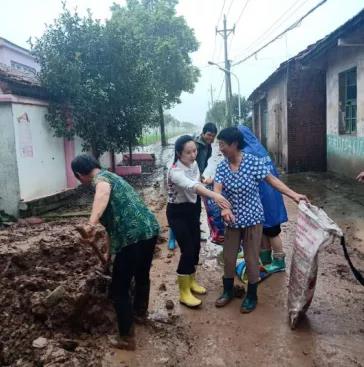 罗田县分水岭村妇联主席带领妇女群众积极参与救灾抢险。