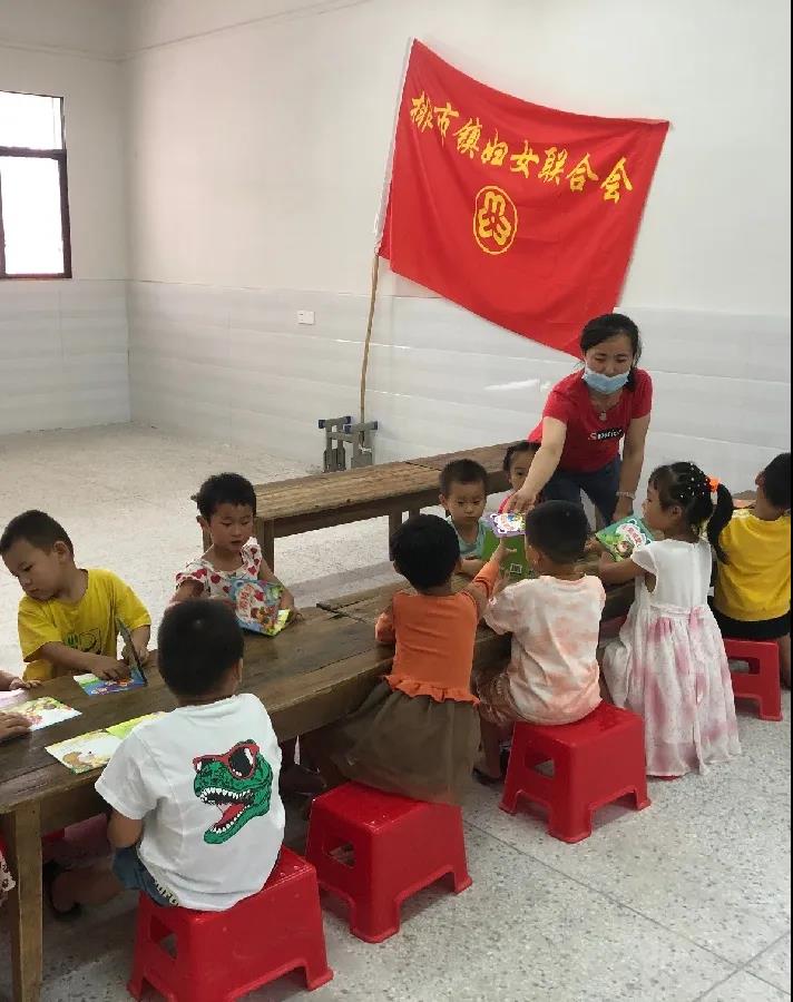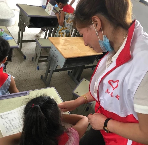 7月20日上午,黄石市巾帼志愿者走进排市小学安置点,陪伴因河堤溃口而受灾的儿童,为他们开展课业辅导、亲子阅读、互动游戏、心理疏导等活动。