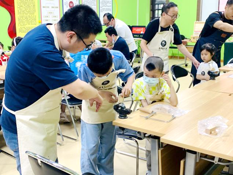 为促进良好亲子关系的形成、提升爸爸带孩子的能力、增强爸爸在孩子成长中的陪伴和交流,5月21日,武汉市武昌区杨园街道临江社区开展了“爸爸力”父爱教育课堂,10位爸爸带着孩子来到社区,开展了一场别开生面的父爱木工课。