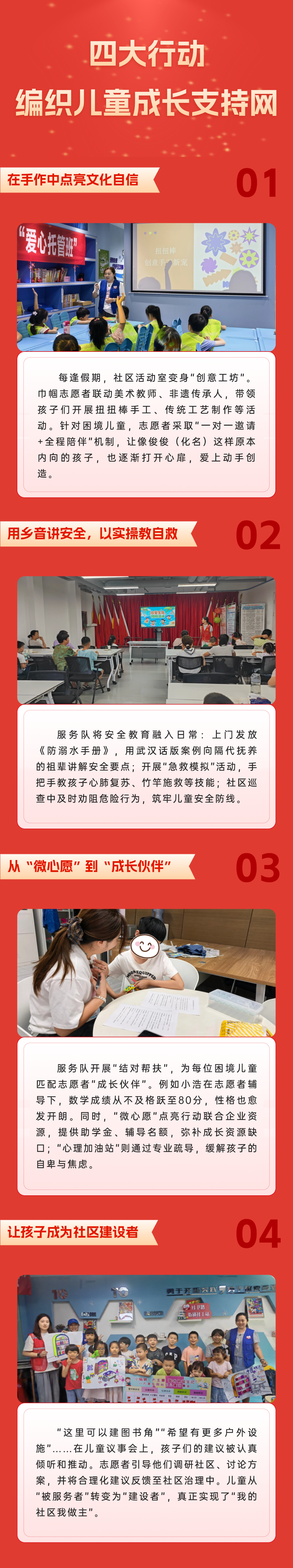 在武汉市青山区红卫路街道,一支由妇联干部、社工和志愿者组成的巾帼服务队,通过“童年一刻 童心飞扬”项目,以手工启智、安全护航、暖心陪伴、议事赋能四维路径,为5700余名儿童织就成长支持网络,守护其自信成长。